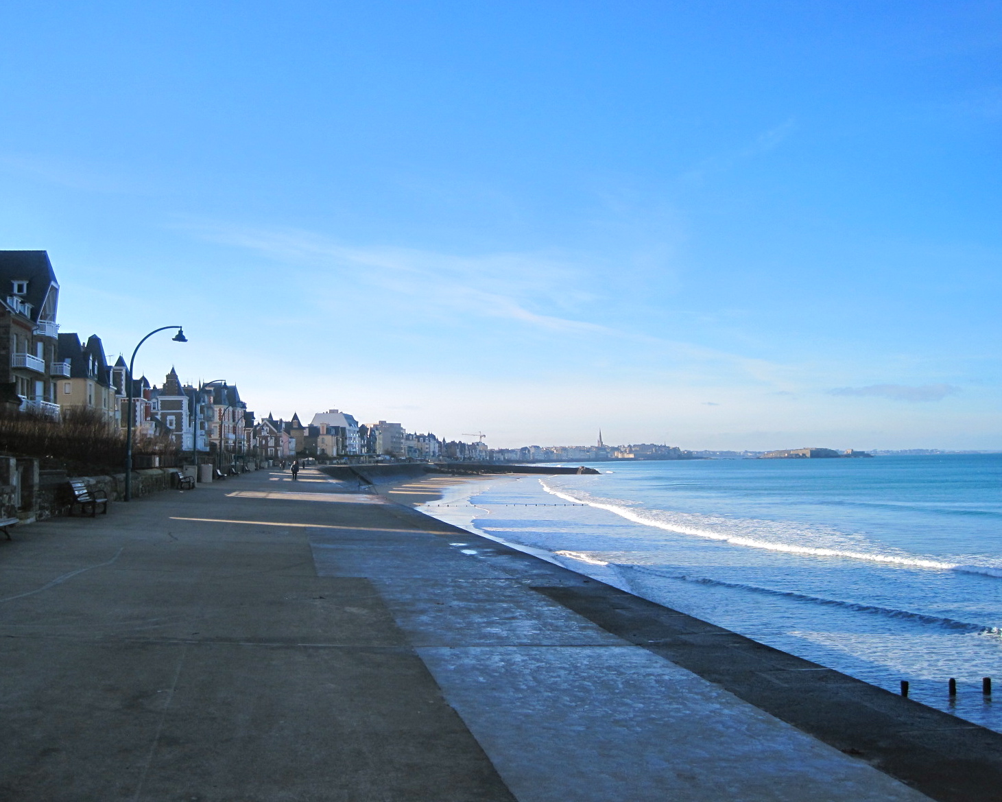 The boardwalk of St Malo, with the ancient walled city in the distance