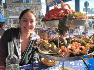 Anyone who has spoken with me in the last year and a half has heard me speak of “the seafood tower”. To call it an obsession would be using too kind and gentle a word: it has been a quest. I have annoyed friends, family and new acquaintances alike with my incessant ramblings about the seafood tower. It all started before I left for Brittany for the first time, over a year ago now (how time flies!). When my sister heard I was moving to Brittany, she sent me a link to Anthony Bourdain’s episode on Brittany. If you’re not familiar with Anthony Bourdain, you should change that right quick! He is a funny, wry and drunken professional chef who travels the world and eats amazing food in his Travel Channel show “No Reservations”.  I recommend that you all watch this episode (which can be bought on iTunes) if you are at all interested in my life here (and I assume you are if you’re reading this!).
