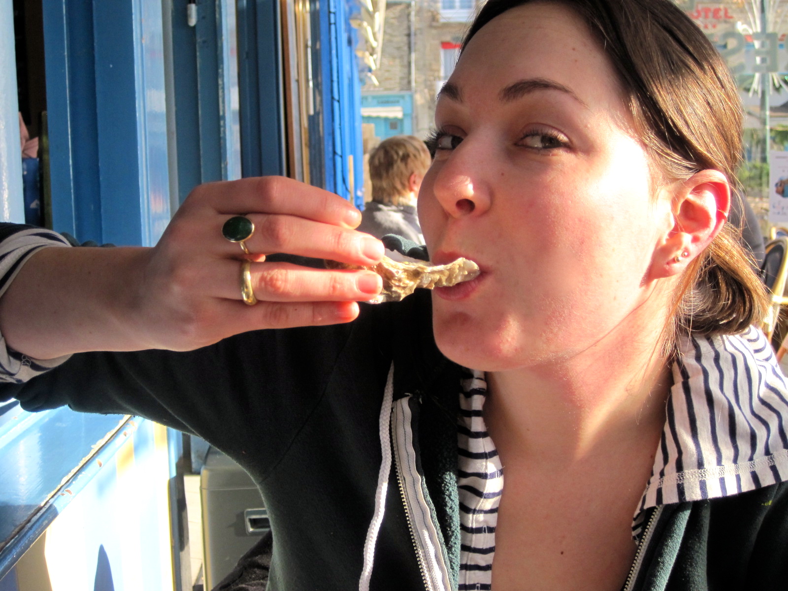 The day started when I met my friend Carolyn in St Malo, which is a beautiful seaside town about 2 hours from Rennes. I had already visited St Malo during the Routes du Rhum (a huge boat race) a couple of months ago, so I didn’t spend much time there today: I had more important things to do, like eat some serious seafood! Carolyn took me for a brief walk on the boardwalk while we waited for the bus to Cancale, and it was lovely to see the ocean again. Having almost always lived within sight of the Pacific, I get separation anxiety when I’ve been landlocked for too long!