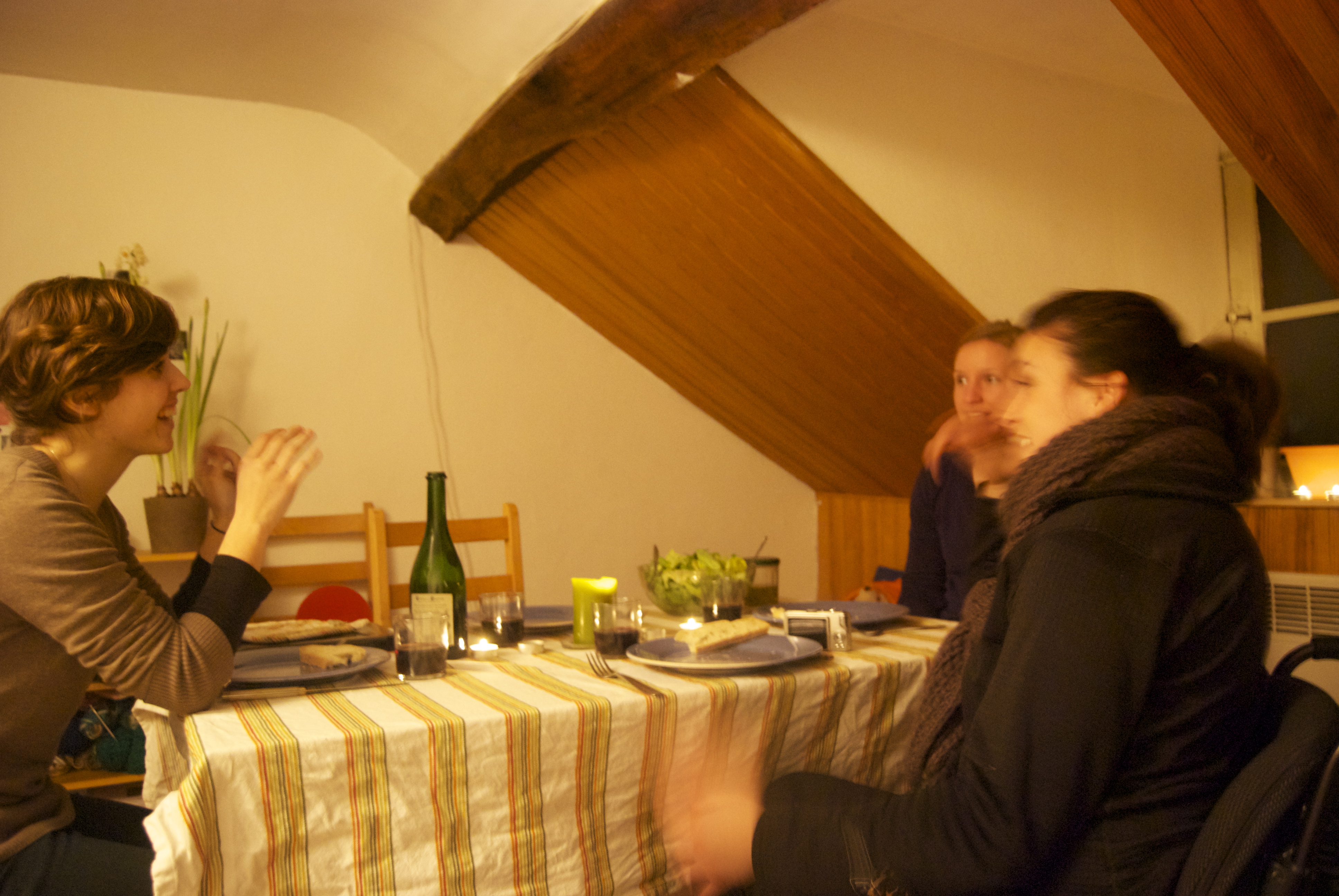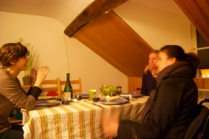 Good friends enjoying good food at one of our favorite local restaurants: my apartment!