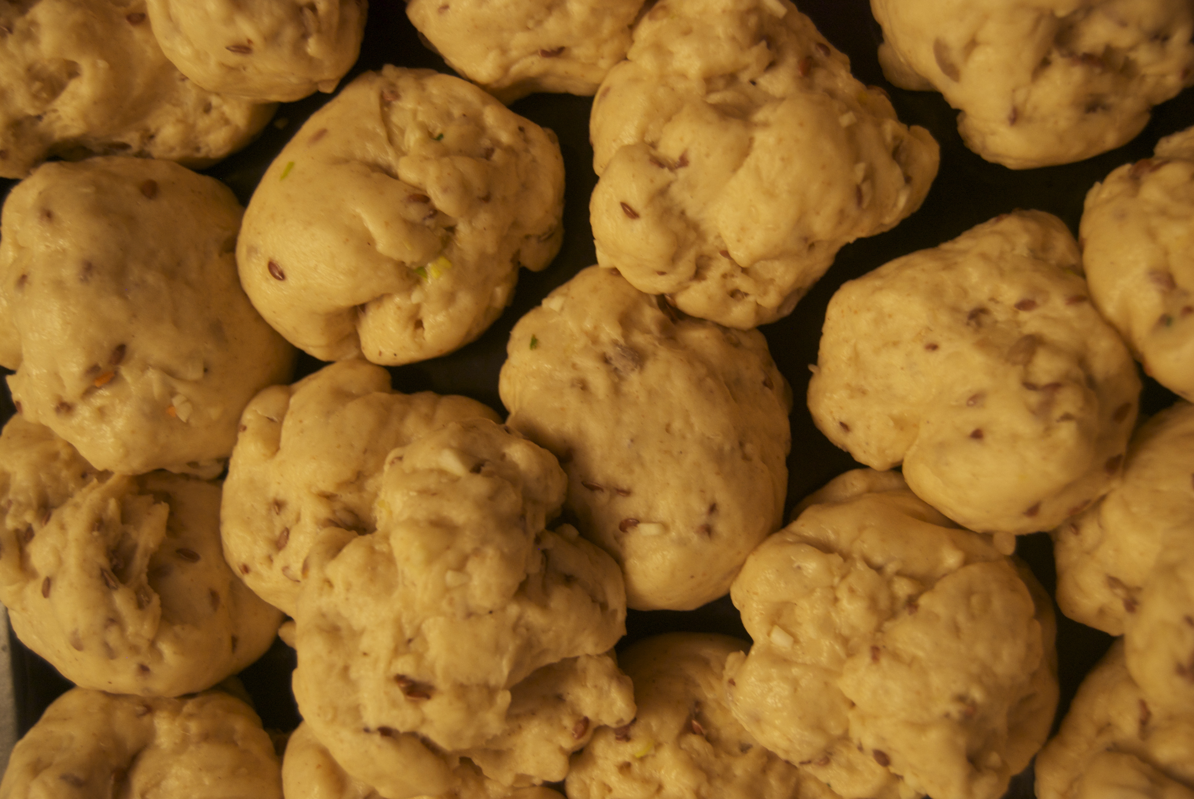 Punch down dough, and knead in garlic. Pinch off small handfuls of dough about the size of a golf ball. Roll into balls, and place on a tray. Cover with a towel, and allow to rise until doubled in size, about 30 minutes.