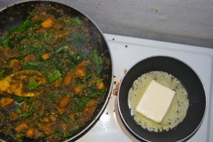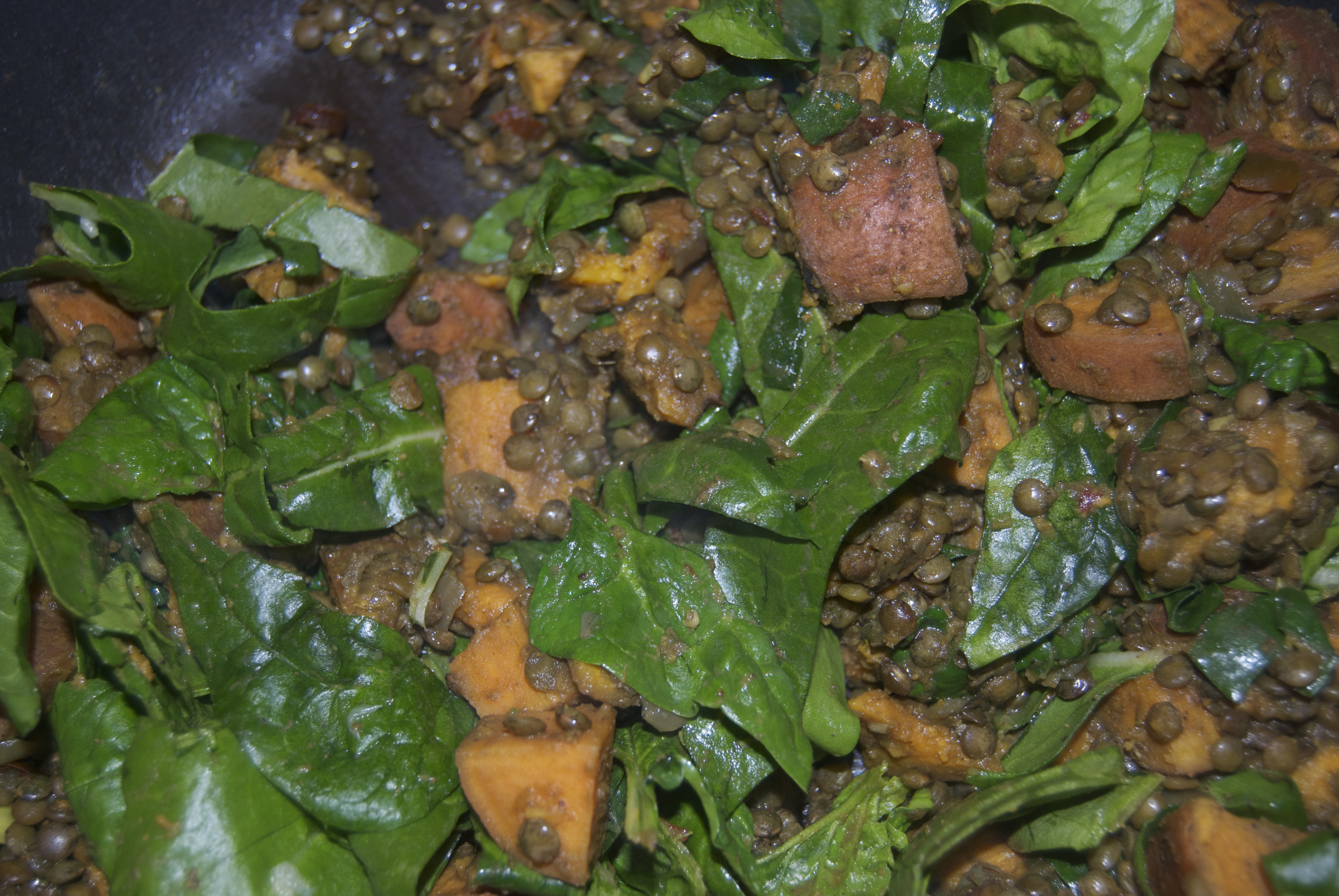 Curried lentils and sweet potatoes with spinach and chard