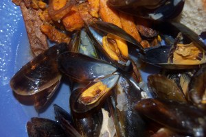 We stuck to the basics and used Julia Child’s simple Moules à la marinière recipe and accompanied it with sweet potato fries. The mussels were succulent and tender, and the sauce was so unctuous and addictive that we all gorged on bread trying to sop up all of the leftover sauce on our plates.  The sweet potato fries were delicious as well. We simply tossed the wedges with olive oil, cumin, cinnamon and coarse sea salt and pepper, and popped them in the oven at 400 degrees for about 20 minutes. A testament to their tastiness: we all know that in England potato is a whole food group of its own, and the Brits love their fries (or chips as they call them – and potato chips are called crisps: confusing, I know).  My British boyfriend, who had never tried sweet potato before actually said “All chips should be made of sweet potatoes!”.  So, all in all a very successful meal – and so simple and easy and hassle free. Try it at home for a taste of Brittany and France.