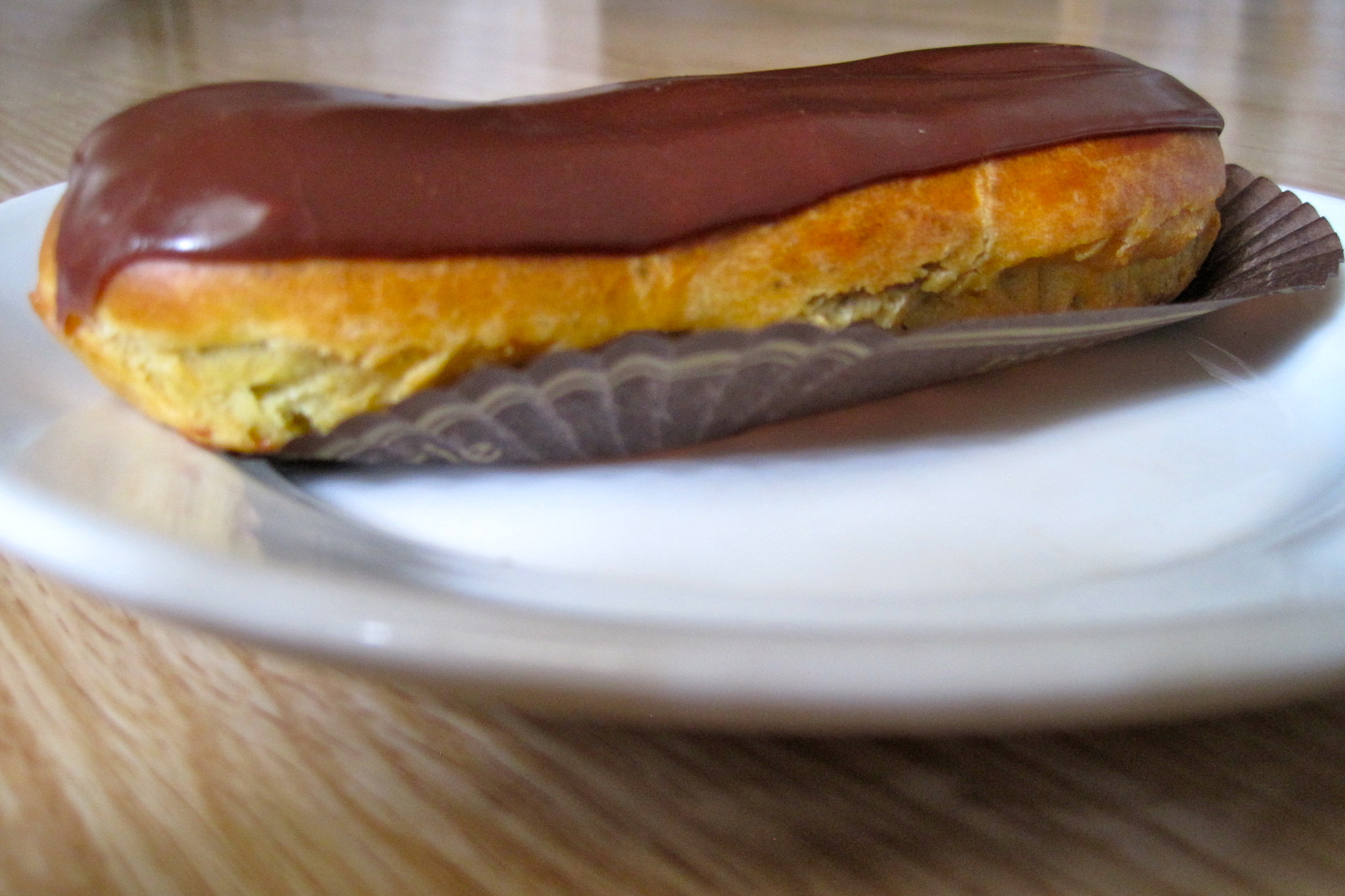 I think you all know the éclair. It is after all one of France’s most renowned creations, right behind champagne and the guillotine. But, just in case you’ve been living under a pastry-deprived rock, the éclair is an oblong shaped pastry made with pâte à choux (choux pastry – the same that is used for cream puffs) and is usually filled with either crème pâtissière (the same thing used in pépitos), simple whipped cream or custard and then topped with either a ganache glaze or fondant icing. They are generally available in chocolate or coffee flavor, but the possibilities are endless if you decide to make it chez vous.  I found a blog that has a great guide to making éclairs, and the pâte à choux recipe listed is by my favorite David Lebovitz.