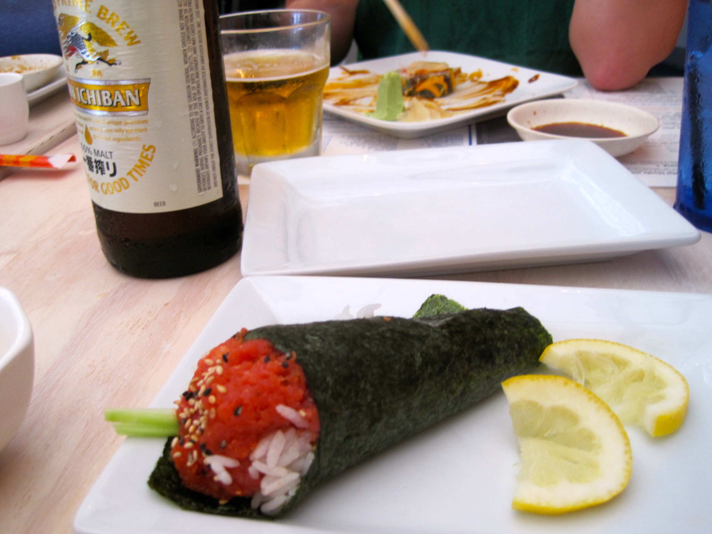 At the other restaurant, HapiFish (stupid name, but amazing happy hour and good sushi) the sake was so cheap it almost seemed they were paying me to drink it. Lord how I missed it sushi! While it’s possible to find very good sushi here in France, it is astronomically priced. So I definitely relished the hamachi and tatake sashimi, hand rolls of all variations and ahi tuna in any form while I was there. Speaking of ahi, my brother made the most succulent, unimaginably delicious seared ahi I’ve ever had, and I’ve had quite a few of them. It was a massive piece of fish (pictured below, on the right) which he marinated in a mixture of shoyu, fresh orange and lemon juices, garlic and ginger. He then reduced the marinade to make it a thick, spicy, and somewhat addictive sauce for the fish.
