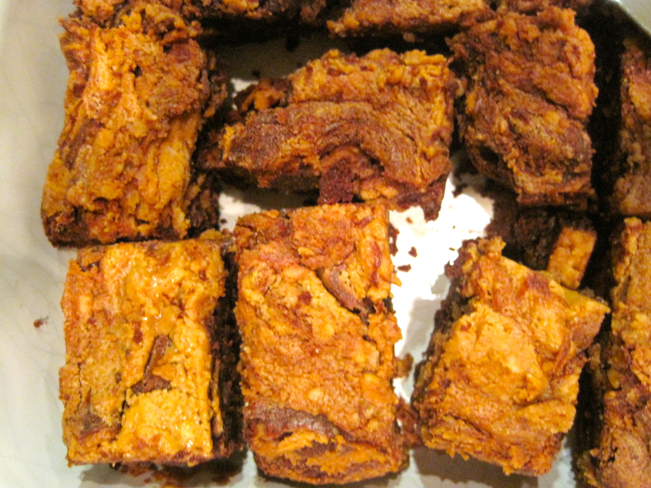 On a happy note, the Peanut Butter Swirl Brownies were almost too decadent. A little bit of these guys goes a long way, and it goes a lot further with a glass of ice-cold milk. Eating them late one night made me feel like a little girl again. My one complaint about the recipe is I felt there was too much peanut butter and not enough chocolate, and as you can see from the photo I had difficulty with the swirl aspect of the recipe. But it was still absolutely delicious and I will definitely make them again, though perhaps with a tweak or two.