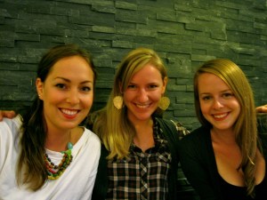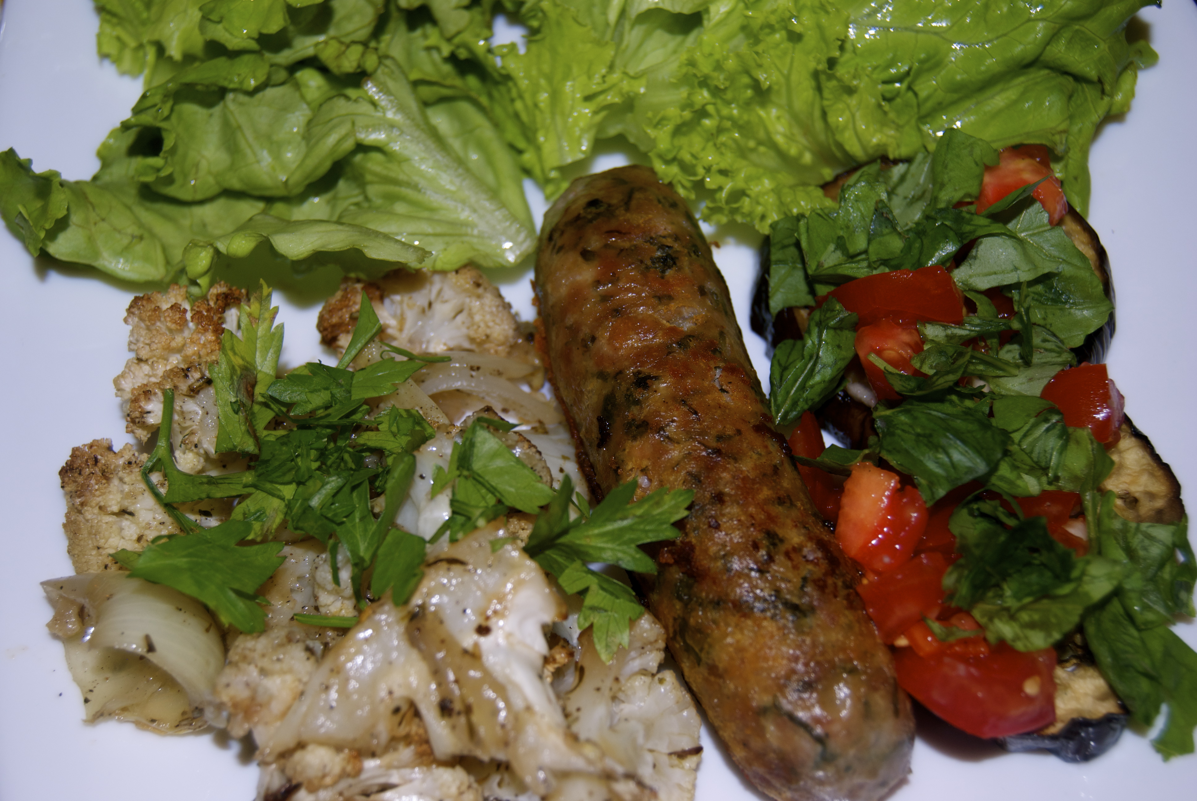 And then there is the return of the weekly dinners with my 2 closest friends here, Berit and Emma (we missed you Jules!). Last weeks’ menu included chicken and parsley sausage (from my favorite poultry guy, mentioned earlier), cauliflower roasted with garlic and onions, salad, and medallions of roasted eggplant with a bruschetta topping. It was a long-awaited reunion, and a much-anticipated meal that did not disappoint.