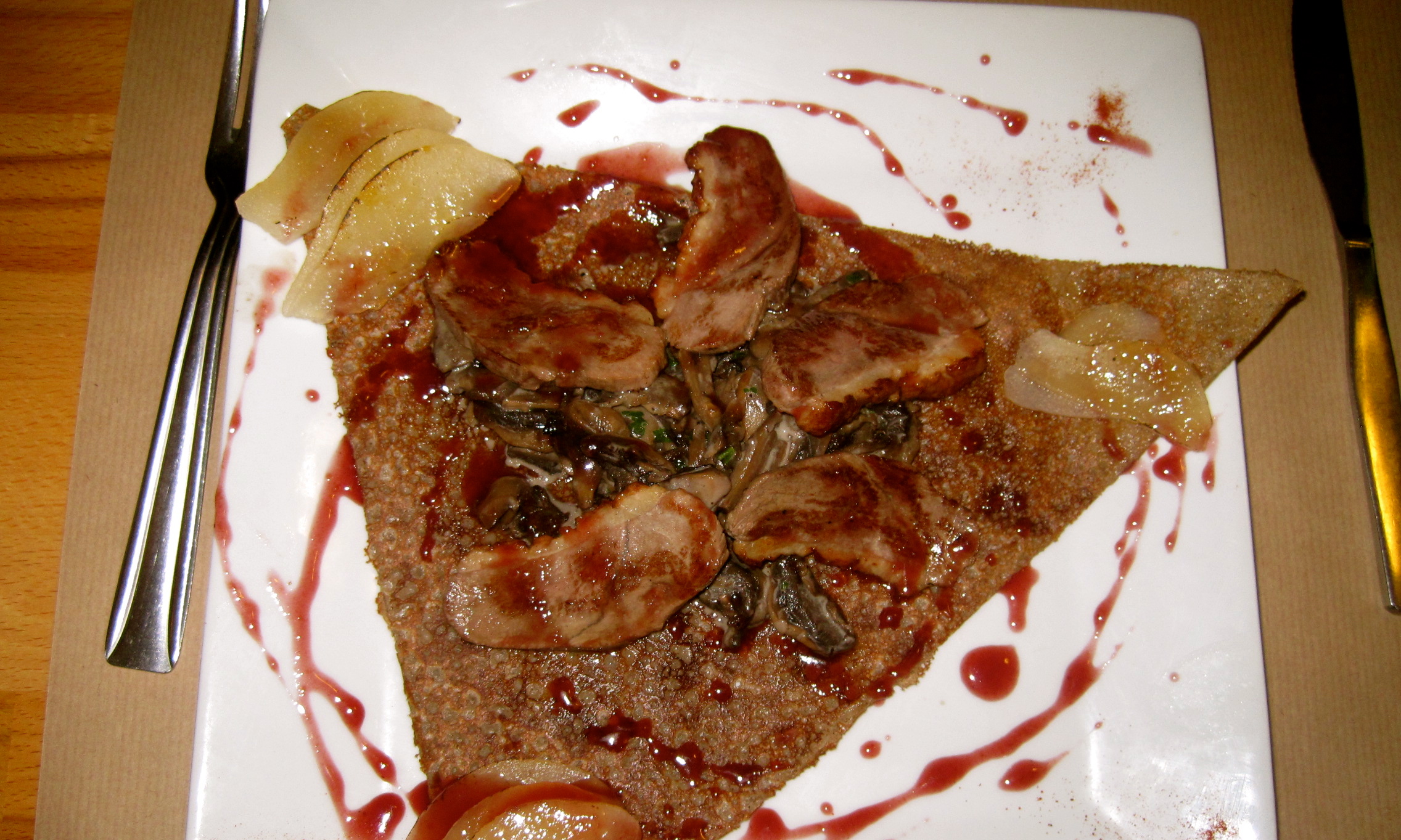 The girls being back has also meant we’ve begun making the rounds to our favorite creperies. The latest one we went to is called Jardin des Saveurs and is just outside the city center, so the prices are cheaper even though the quality is amazing. I had a galette with creamed leeks, smoked salmon and scallops. It was heavenly. My friends had equally amazing galettes as well. I was particularly jealous of one which had duck with pears and a fig reduction (pictured below, in center).
