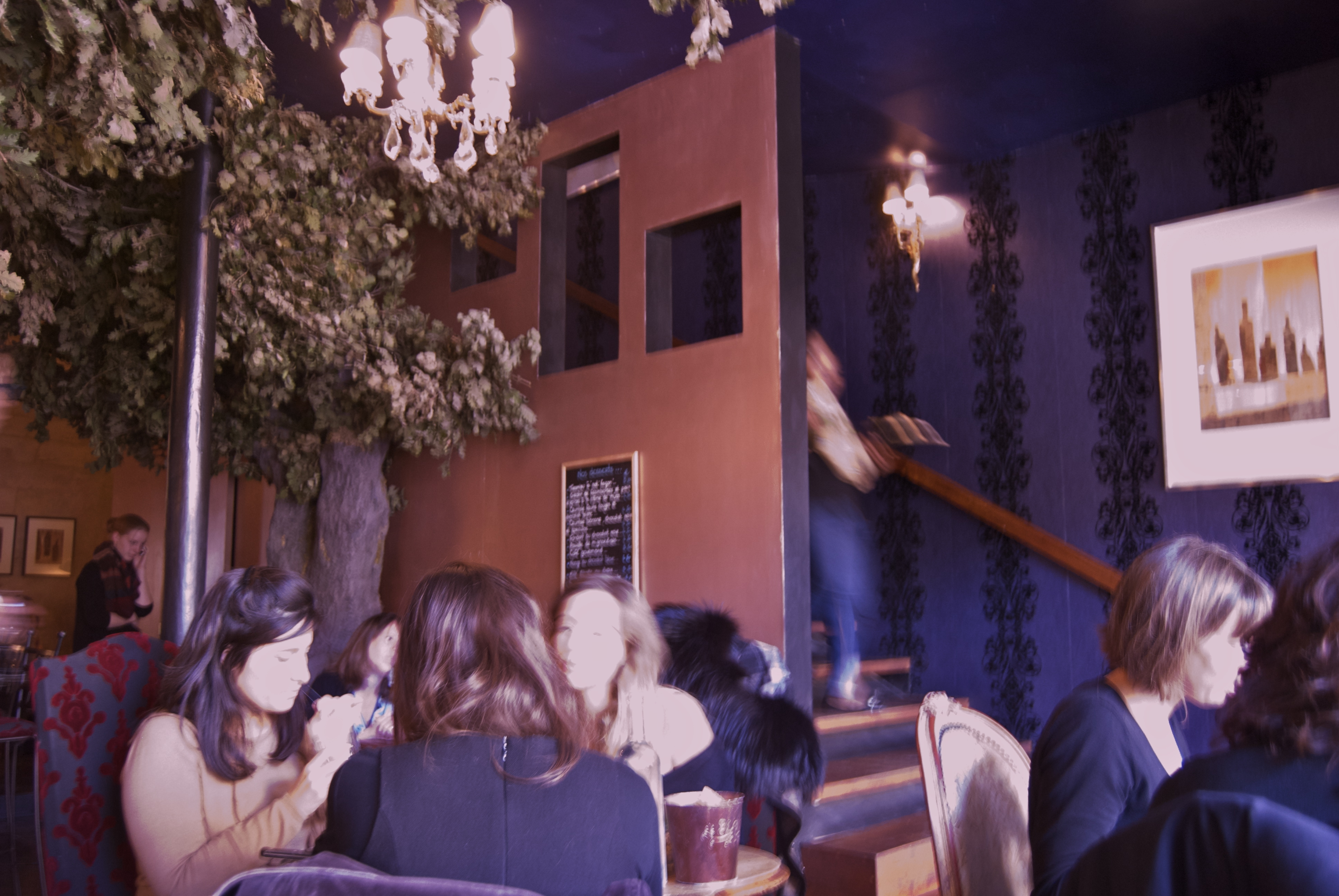 We realized we were close to L’Autre Petit Bois, a wine bar I had read about in this New York Times article. I was shocked to find that a place they recommended was actually affordable! But it was: we had a wonderful lunch, a bottle of wine and dessert for around 15 euro each. I had a foie gras tartine and for dessert we all split a coffee tiramisu and a banana chocolate crumble. But just as much as the food we enjoyed the cool kitsch interior, which included a faux canopy of trees and a lot of chandeliers. Somehow it worked.