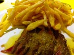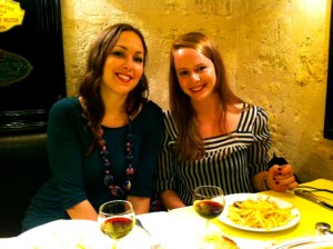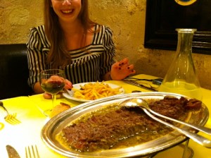 Monday night we finally made it to L’Entrecote, the aforementioned restaurant with the huge line to find out what all the fuss was about. Through research we had learned that it is a very famous restaurant that serves only one thing: steak and fries. And they do it well. We queued up half and hour before the restaurant opened and there were already at least 60 people in front of us. Happily we managed to get a table in the first round of seating. A waitress came to our table right way to ask how we wanted our meat cooked. All three of us chimed “à point” (medium-rare). We were briskly served red wine, a simple salad and a basket of bread. A short while later each of us received a huge white plate full of fries with the most dismal little portion of meat. We looked at each other with crest-fallen faces. That’s all!? This is what all the fuss is about!?