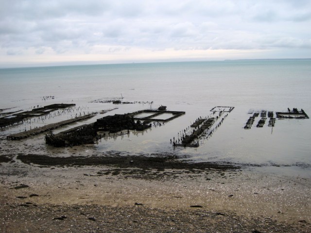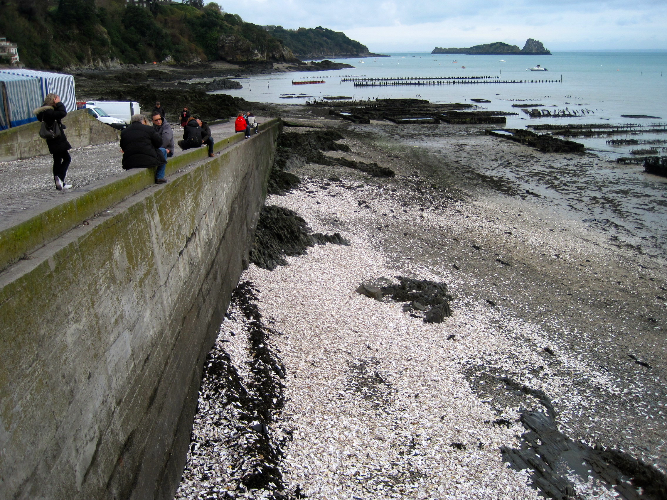 We tucked our pastries away to enjoy later and headed down the hill to the boardwalk. We still had a bit of time to kill before our lunch reservation so we took a seat near the pier where we had an excellent view of the sprawling oyster beds reaching out across the bay to the distant Mont Saint Michel . Chatting couples and families settled down to freshly shucked oysters bought from the nearby oyster stalls. We watched as oyster after oyster slid down greedy throats, the shells chucked onto the beach below where they disappeared into the mass of white oyster skeletons. Fingers were licked, lips were smacked and then they dove back in for more.