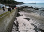 People sitting on the wall to devour oysters. The white on the sand below is all the old oyster shells