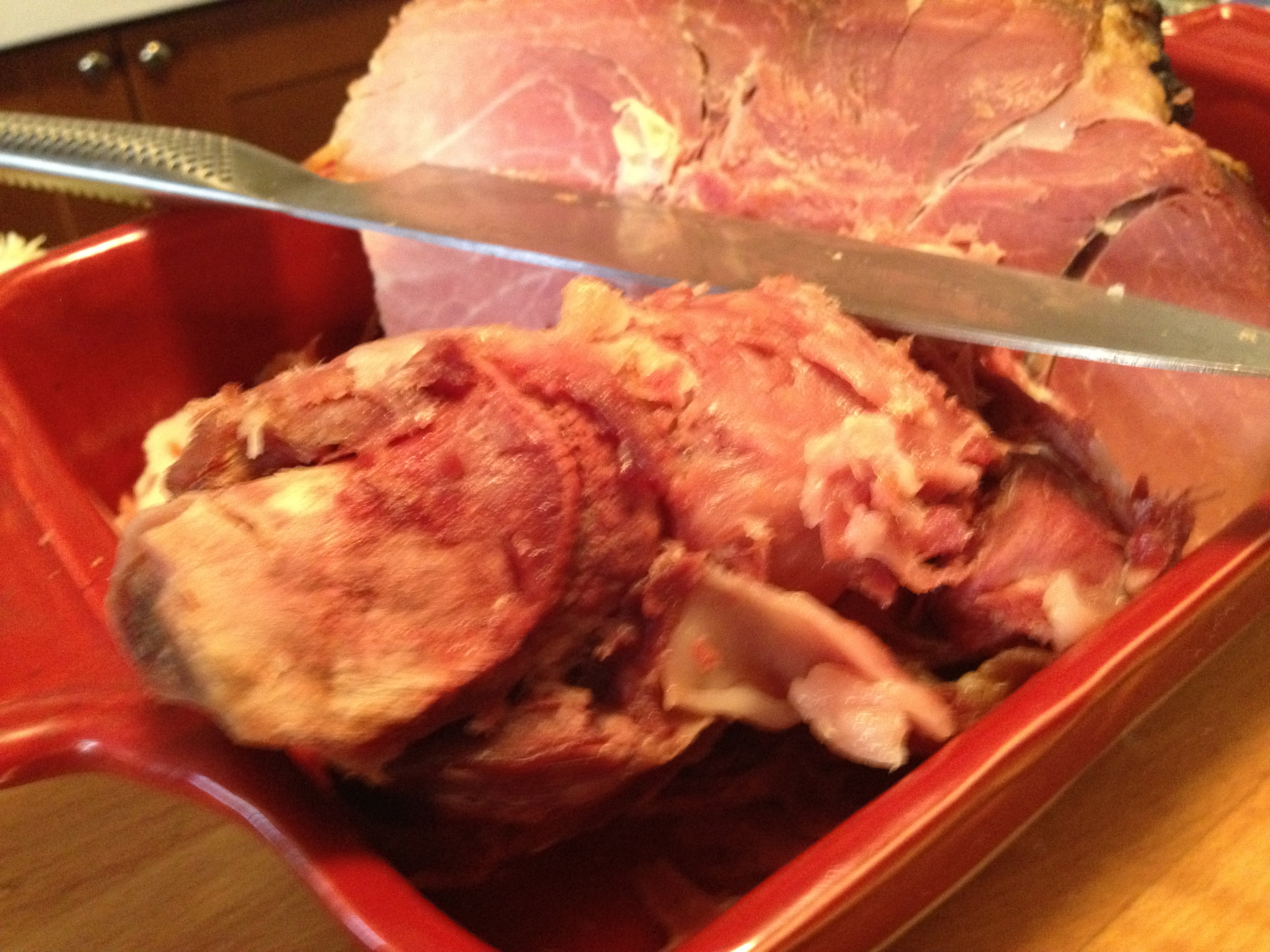Christmas Eve Dinner: Country ham served with grits, smoked salmon, saucisson sec, cheese, broccoli, green beans and brussels sprouts. Phew...