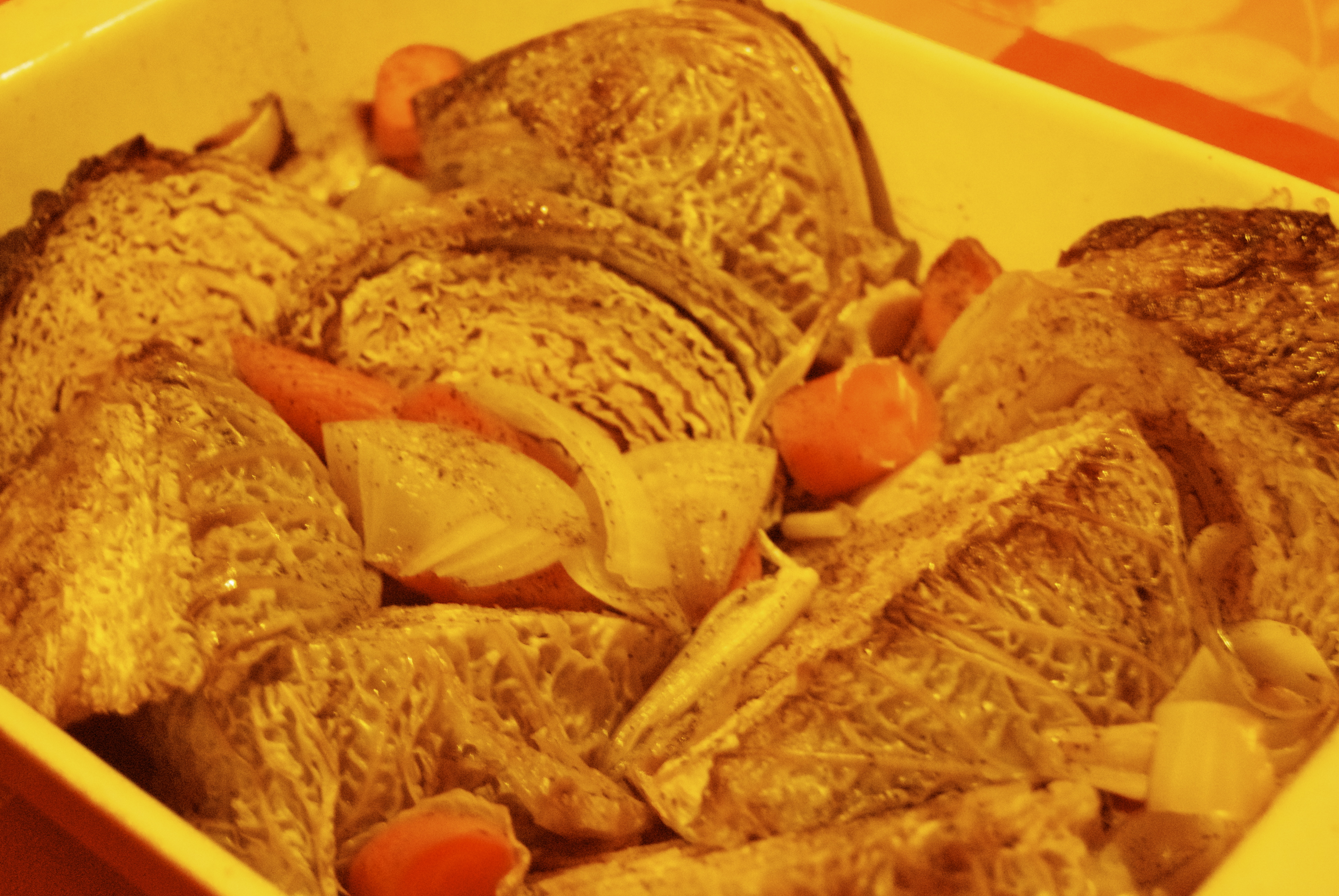 Pour the olive oil and broth over the veggies and sprinkle with salt and pepper. Cover the dish tightly with aluminum foil and cook in oven for roughly 2 hours. Check the cabbage halfway through cooking to ensure that the leaves are not at all dry. If they are, add a few more tablespoons of broth and/or olive oil.