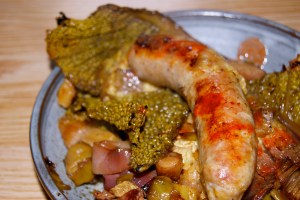 Sausage on Braised Green Cabbage and Leeks with Apple Cider Vinegar