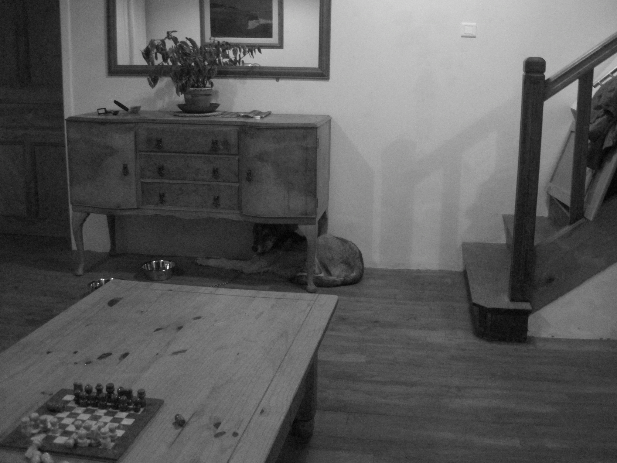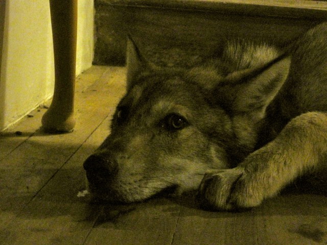Welcome home Shilah! Meet the sweet pup we adopted from Association Pas Si Bête, a nearby refuge center which specializes in very difficult-to-handle dogs, such as wolf dogs like this little guy . He’s 5 months old and already incredibly scarred from the terrible treatment he endured at the hands of his breeder. As you can see from the photo above, he’s very shocked and scared to suddenly find himself in a new environment, and he doesn’t quite know what to make of us cooing over him constantly. His trust will come slowly and so far he shuns our company and prefers instead to hide under the closest piece of furniture.