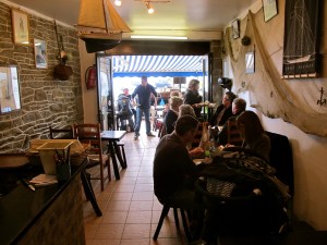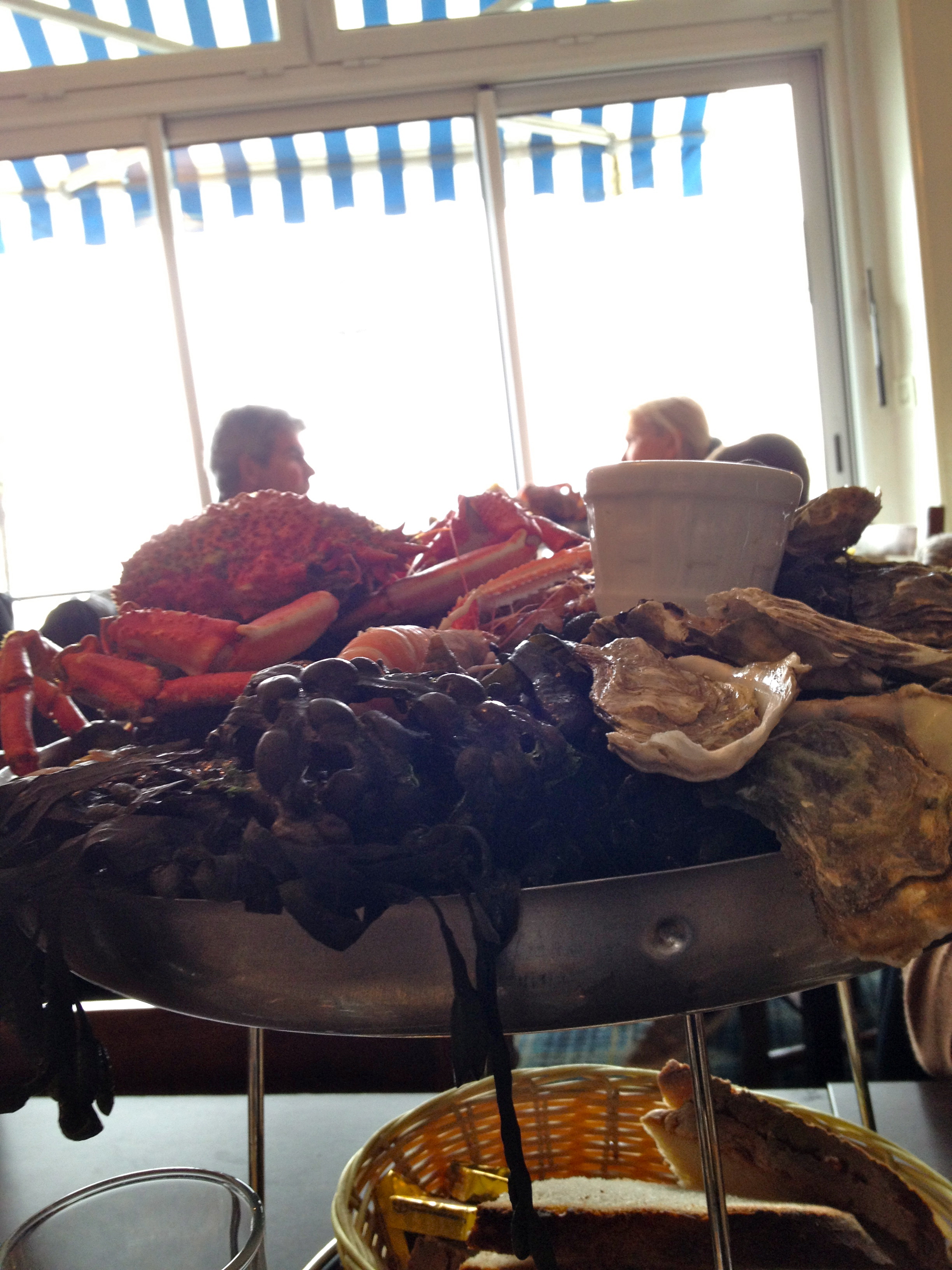 After our delightful oyster appetizer, we sat down at  Au Pied d’Cheval, my favorite spot in Cancale for the Seafood Tower and tucked in. A whole crab, hoards of miniature shrimp, langoustine, boulots (whelks), clams, more oysters…all topped of with yet more muscadet and endless bread and Breton butter. The food was so fresh it was literally still alive…clams that wiggle when you poke them with your fork, little crabs that crawl out of the mound of seafood treasure. This is why I live in Brittany! After all my time in Brittany, it felt so special to share some of my favorite things about its’ wonderful culture with my family. It was really a magical meal.