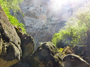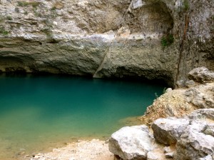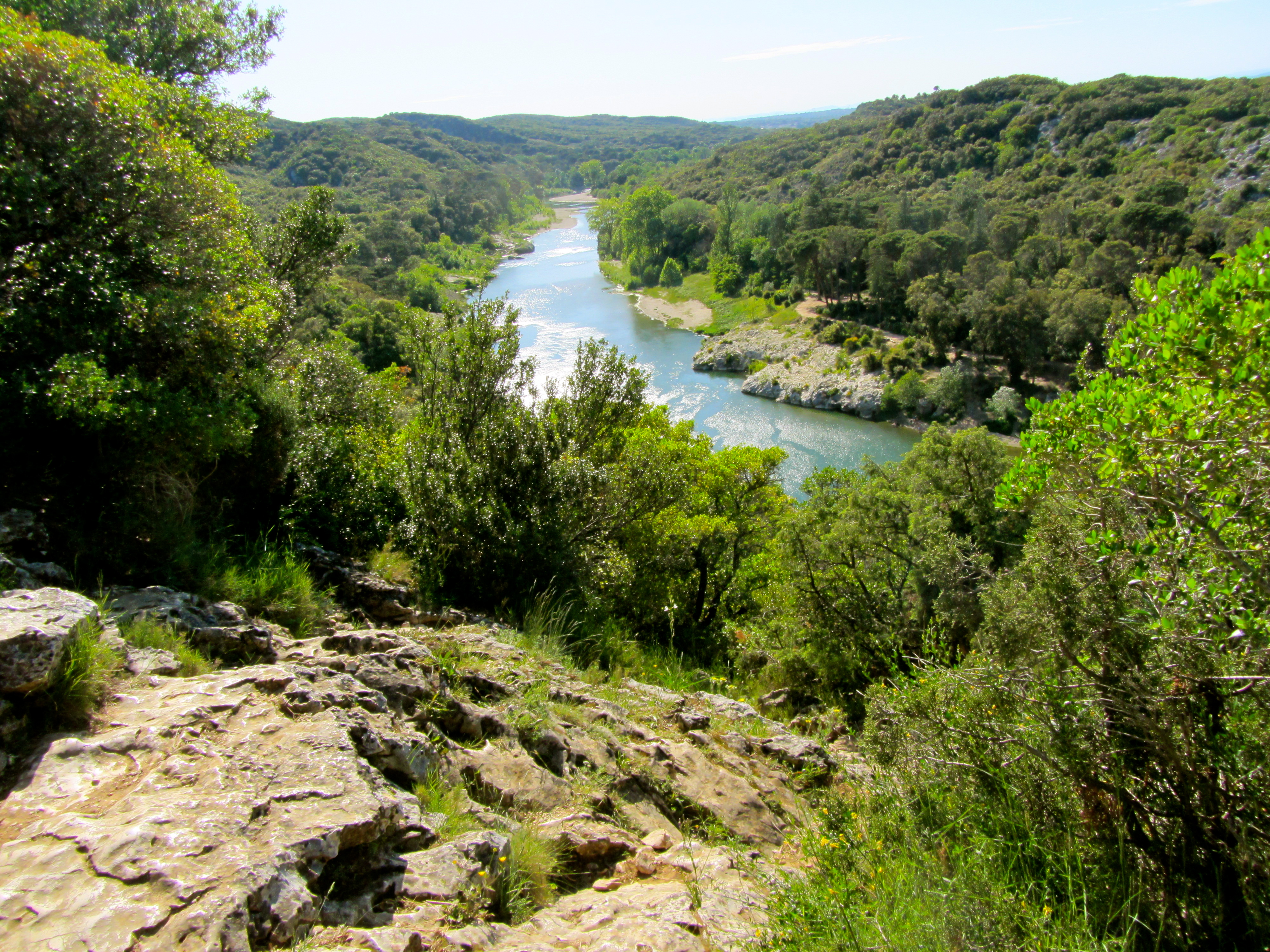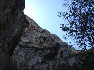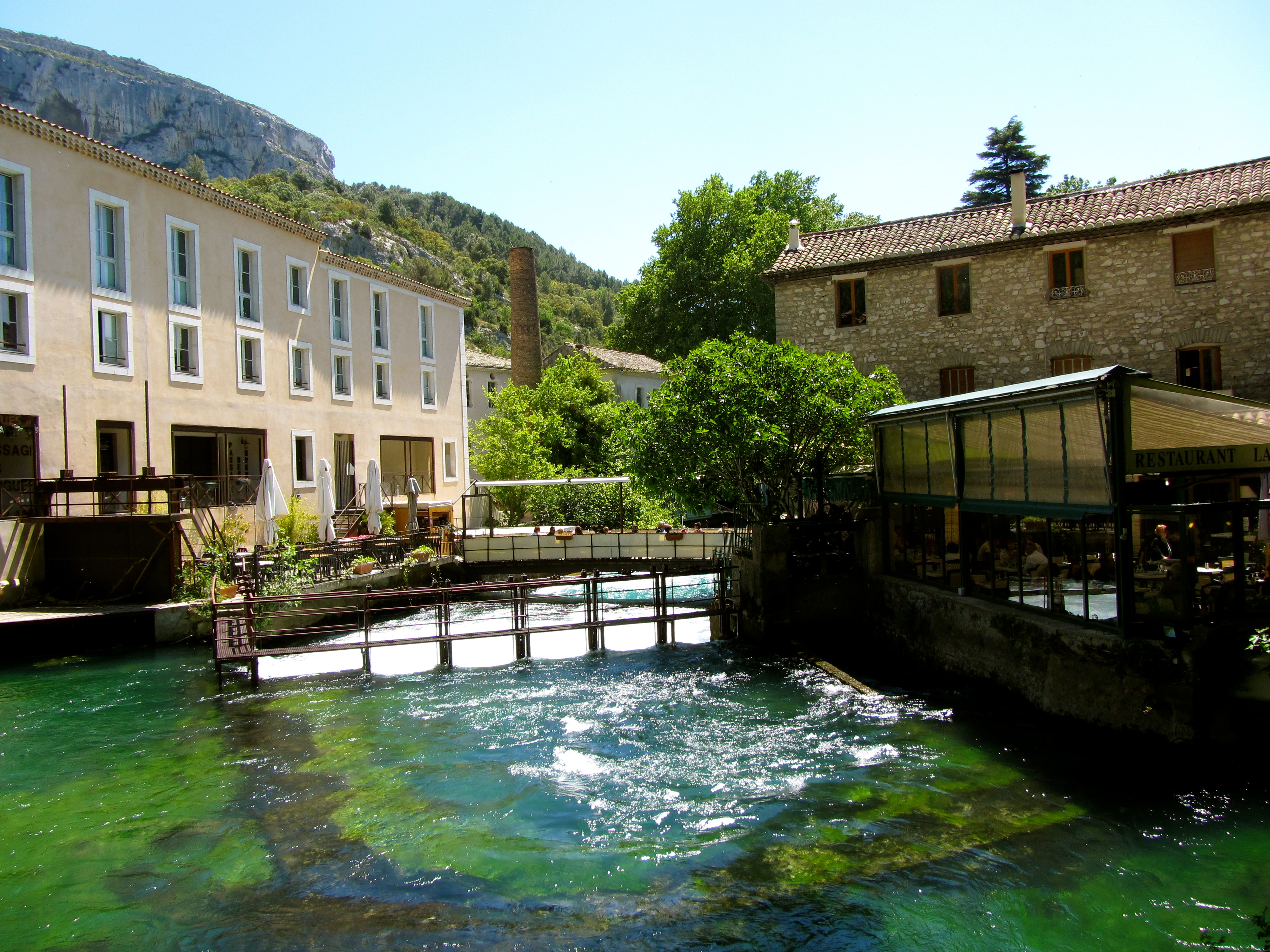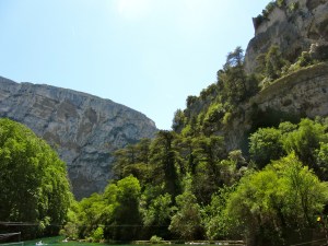 The base of the quaint village of Fontaine de Vaucluse, the rest of it winds up into the nearby cliffs along the Sorgue.                                                                 The River Sorgue                                                                          The cliffs hovering above Fontaine de Vaucluse.     There was a kayak race that day on the River Sorgue.                  The source of the Sorgue, which flow up from a deep underground river. During heavy rains, the source connects to the river below. Throughout most of the year, the river starts beneath the rocks that separate it from its source.