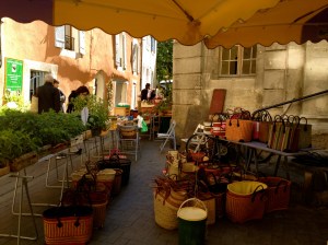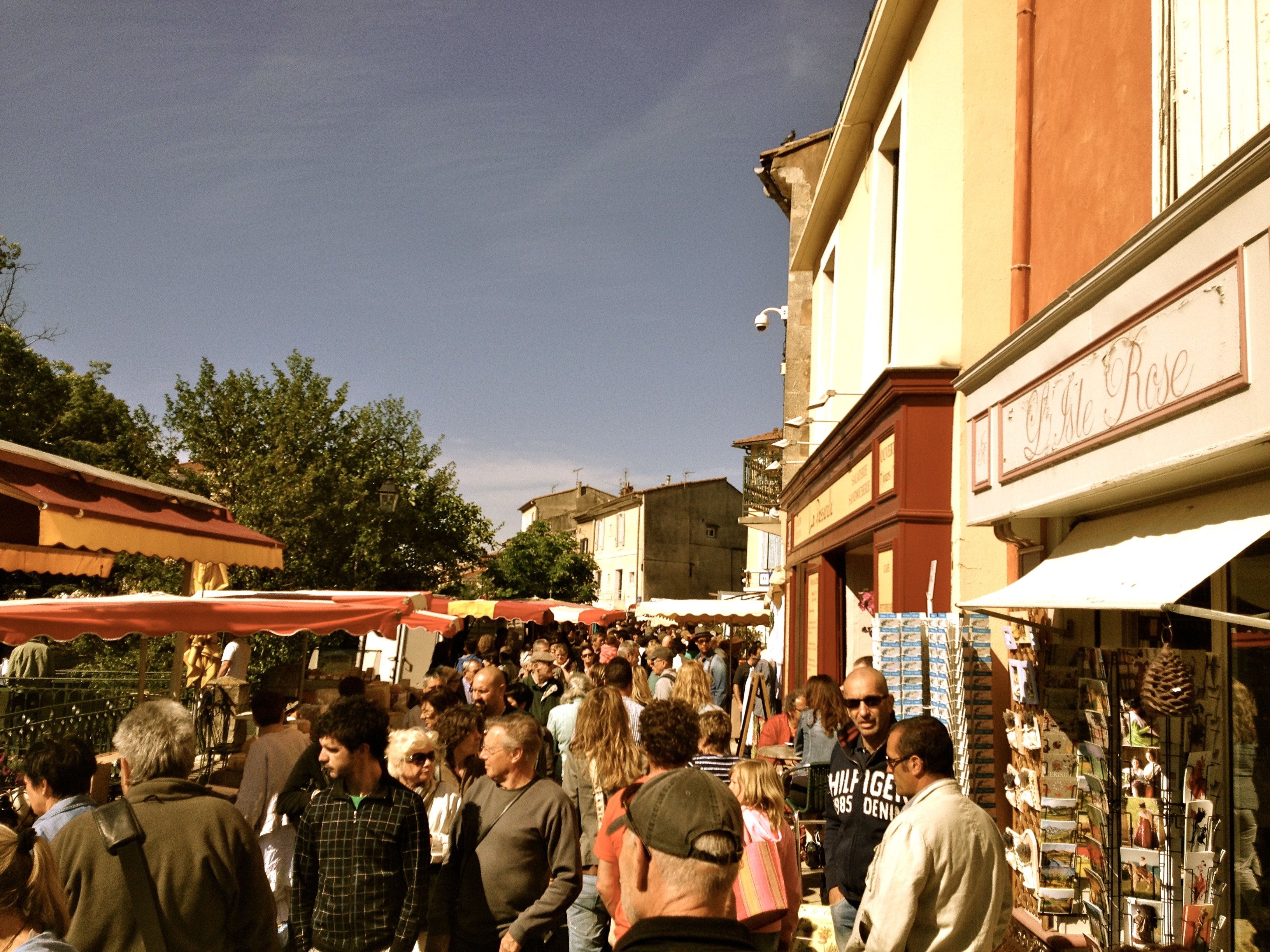 Day 4: L’Isle-sur-la-Sorgue is a small town best known for its antique markets and epic Sunday market. Once a week the whole town turns itself inside out and transforms into one giant marketplace. All along the canal, in every little alley street, there are stalls with vendors proposing baskets, pottery, handmade quilts, lotions and soaps, tapestry, antiques…everything the heart could desire. And the food vendors…offering up samples of olives glistening like jewels, tapenades of so many varieties, fresh produce bursting with color and taste, handmade focaccia, bread and pastries, and of course, cheese galore. You haven’t lived until you’ve had goat cheese from the South of France. Prepare yourself though, you’ll never see a market this crowded. It is difficult and expensive to find parking. We were lucky we were staying in a hotel in L’Isle-sur-la-Sorgue which offered parking for its guests (in a parking lot that was highly guarded to ward off market visitors poaching the guest spots).
