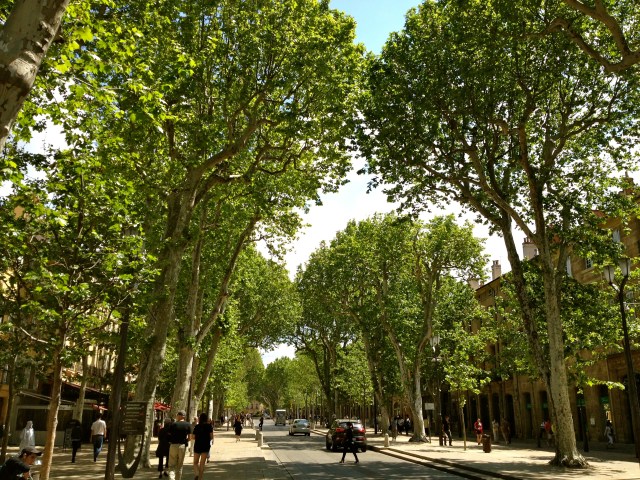 The Cours Mirabeau, the grand tree-lined boulevard that runs through the center of Aix, dissecting the “old” city from the “new” city. These are relative terms as the new city was constructed starting in the 18th century.