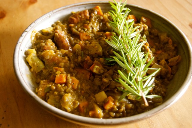 Add all the remaining ingredients, with the exception of the vinegar and the parsley. Cover and bring to a boil, then remove the lid and reduce heat until the stew is at a simmer. After the stew has been simmering for about 10 minutes, add the zucchini. Leave the stew to simmer for a further 15-20 minute or until the lentils are tender.