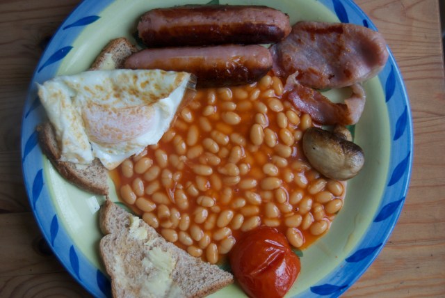The perfect start to a brilliant birthday: 2 Richmond Sage and Onion Sausages, English Bacon from Sainsbury’s, Heinz Baked Beans, Fried Mushroom and Tomato, Buttered Toast and 1 egg fresh from the girls in the yard, fried.