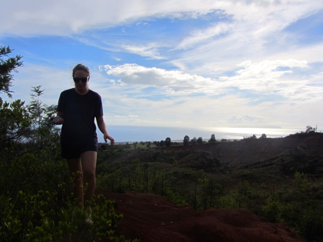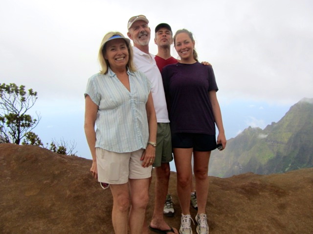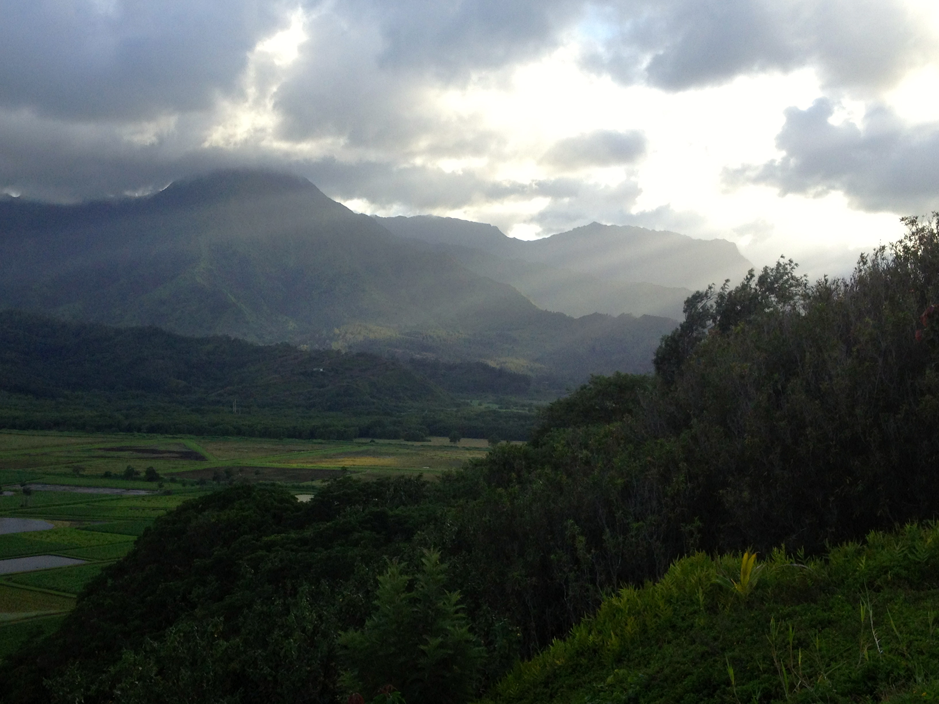 The very top of the mountain, the overlook of the Kalalau Valley. When we arrived, the view of the valley below was impeded by swirling mist. As we stood there saying what a shame it was that Toby couldn’t see the most beautiful view on the island, the mist suddenly started evaporating until suddenly, what an instant before had been a grey wall of cloud, had disintegrated into the breathtaking view down the mountainous valley that leads down, ending in the wild ocean of the Napali coast.