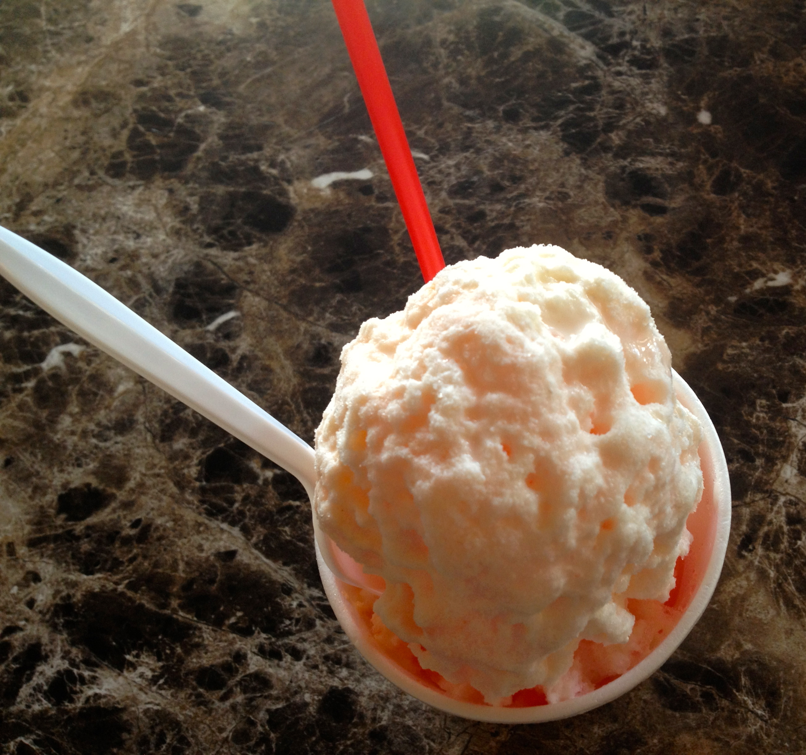 My shave ice: Guava, Coconut and Lilikoi (Passionfruit) with Haupia (Coconut Custard) Cream Topping