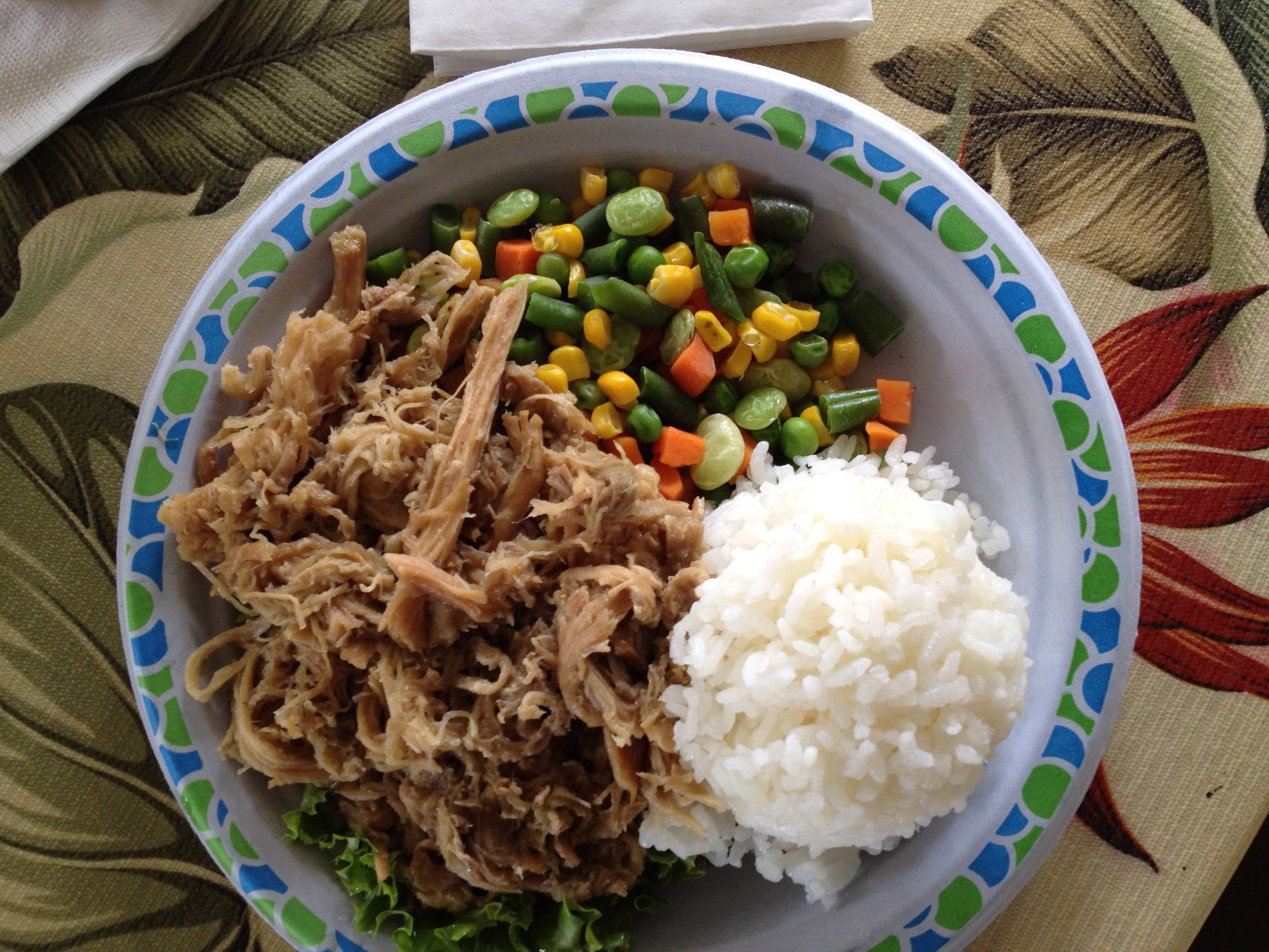 Kalua Pork (cooked in an imu, an underground pit) with Rice and Veggies